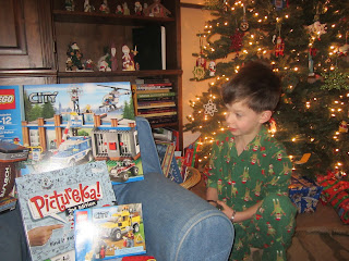 Christmas Morning was super fun again this year. Once again, Brent and I were able to get showered and dressed before the boys woke up. Every year I think we won't be able to do that again, but it keeps working out! Brent told the boys they were to stay in their rooms until we came to get them, and so when we heard Jonathan was awake, we woke the others up too. We stopped for a couple of excited pictures on the stairs before we headed in to the living room.